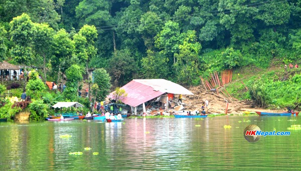 पोखरा फेवातालपारिको किनारमा रहेको टिपिकल रेष्टुरेण्ट पहिरोले पुरेको छ। रेष्टुरेण्ट पुरिँदा ३ जनाको मृत्यु भएको छ भने १ जना बेपत्ता भएका छन्। मृत्यु हुनेमा रेष्टुरेण्टमा कार्यरत ओखलढुंगाका प्रकाश मगर, सिन्धुलीका मोहन मगर र सिन्धुलीका राम मगर रहेका छन्। रामेछापका भुवन मगर बेपत्ता छन्। बेपत्ता मगरको खोजि भईरहेको छ। राति करिब २ बजेतिरको पहिरोले उक्त रेष्टुरेण्ट बाढीले बगेको थियो । तस्बिरः सुदर्शन रञ्जित / एचकेनेपाल डट कम